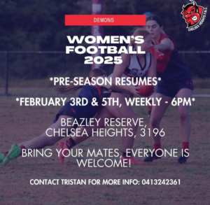 The Chelsea Heights Football Netball Club is encouraging any women wanting to give football a go to join their club for the 2025 season!