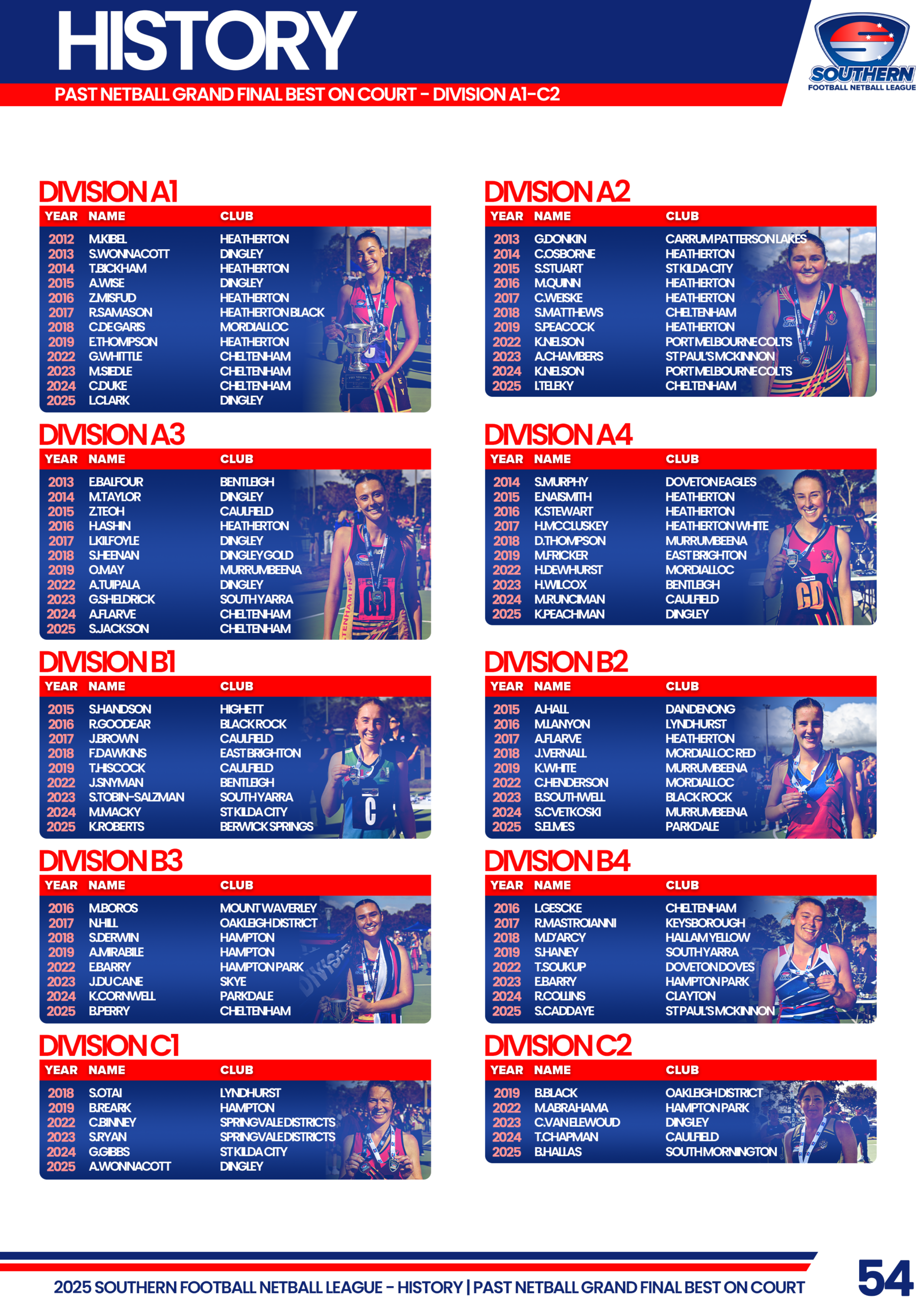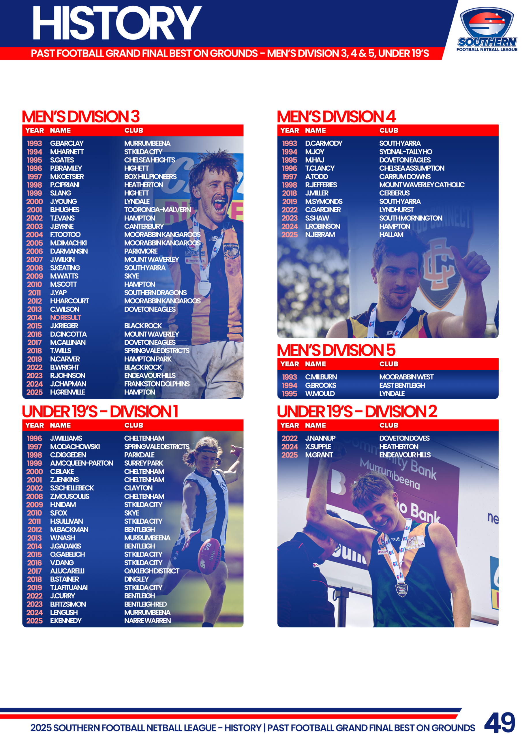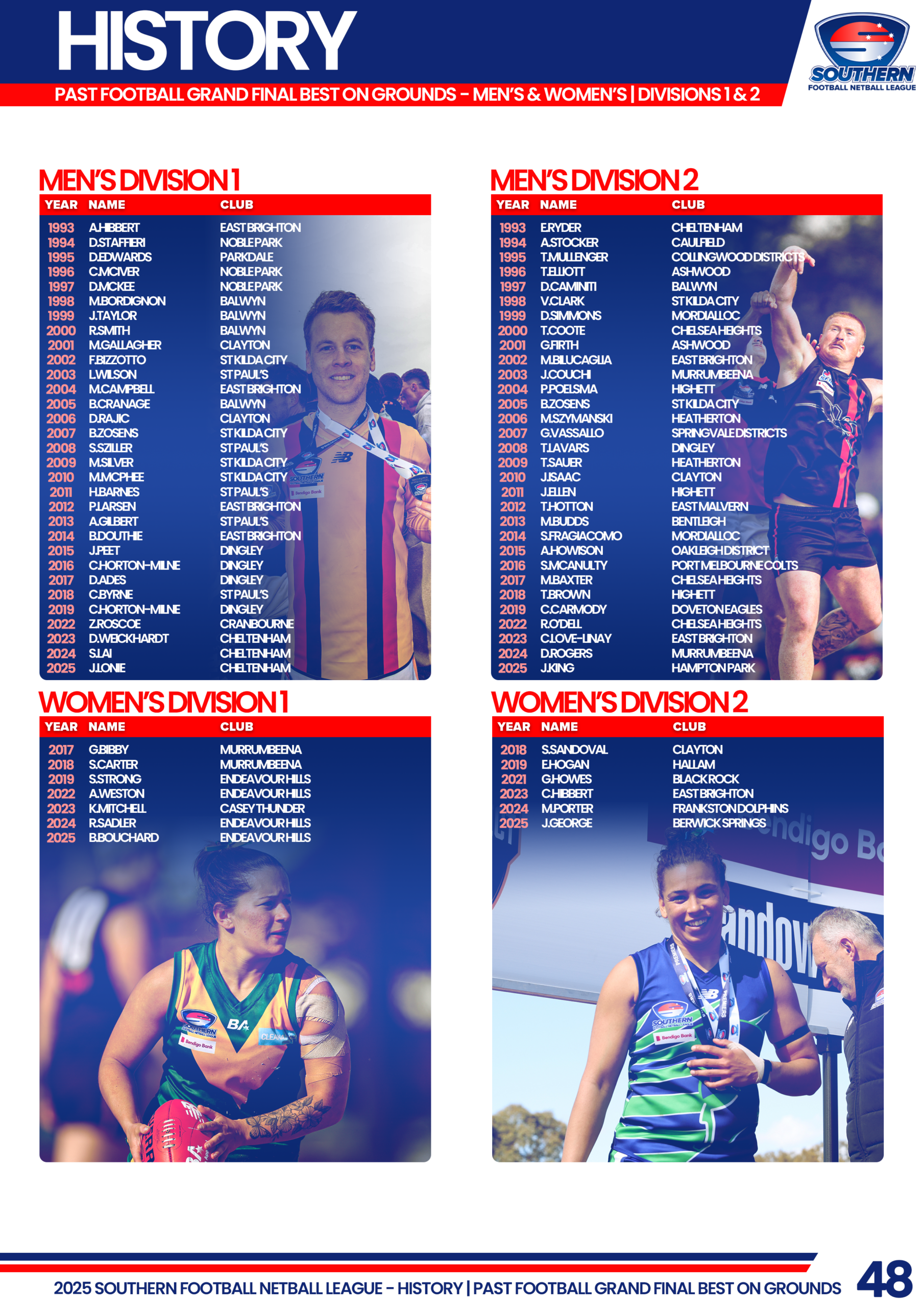 Click on the divisions below to view the full list of SFNL Grand Final Best on Ground/Court Medalists by year.